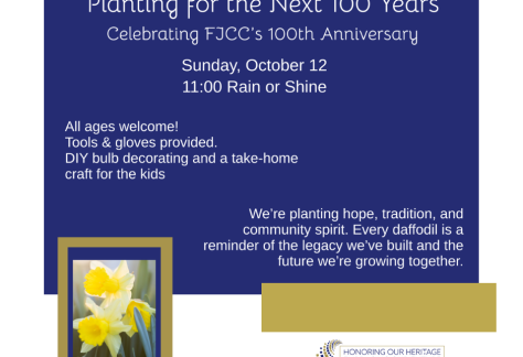 For the children, we have created a special participatory event so they can celebrate the FJCC’s upcoming 100th anniversary. On October 12th at 11:00, together we will gather to plant 100 daffodils around the FJCC. Bulbs, and tools will be provided. There will be a craft and food for anyone who helps in the planting. Join us!