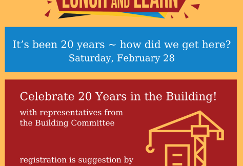 We look forward to a look back 20 years and the building of our new home. On Saturday, February 28th at noon, we will hold a Lunch and Learn to celebrate our move to this building, our Chanukat HaBayit. Check out this 2-minute video!