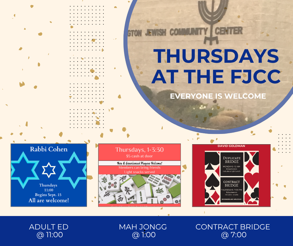 Thursdays at the FJCC All are welcome to join us on “Thursdays at the FJCC” for: Adult Education Class with Rabbi Cohen at 11:00 am, Mah Jong at 1:00 pm Contract Bridge at 7:00 pm Contact the office for more information — online link, occasional cancellation, etc. + Add to Google Calendar + iCal / Outlook export Date Oct 30 2025 Time All Day Category Center Series Non-Hebrew School