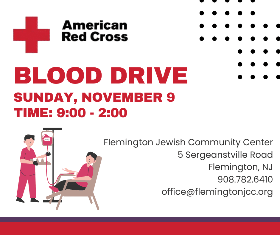 Blood reserves are always low after the long summer months. Please help out by volunteering to donate blood at the American Red Cross led blood drive to be held at the Flemington Jewish Community Center on Sunday November 9th from 9:00 – 2:00. Your donation is a mitzvah!