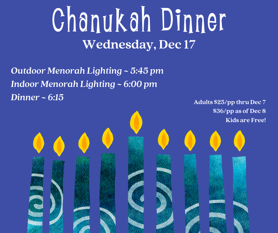 Come light your menorah — together with the FJCC community. On Wednesday, December 17 starting at 5:45 is our family-favorite Chanukah celebration. We will first gather outside at 5:45 to light all the menorah on the lawn, then we move inside at 6:00 when each family lights their own menorah and then we celebrate with a festive meal. Important: bring your menorah and candles. Please RSVP and register on ShulCloud.