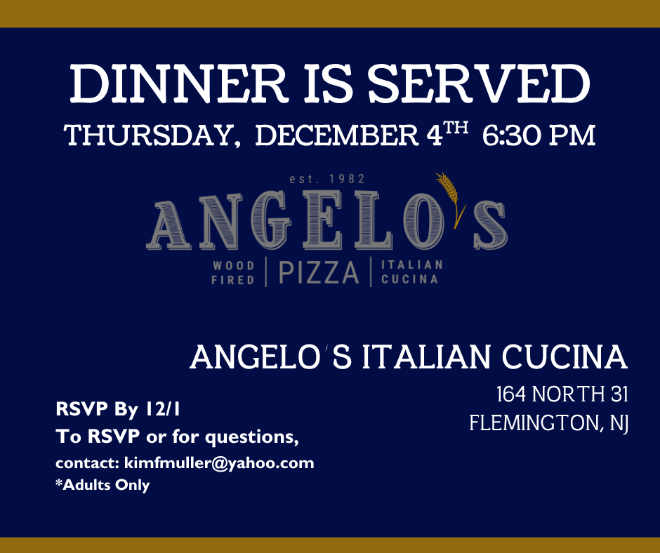 Dinner is Served this month will be at a Flemington favorite, Angelo’s Italian Restaurant. Yum! We look forward to seeing you on Thursday December 4th at 6:30 pm. Please RSVP to Kim Muller.