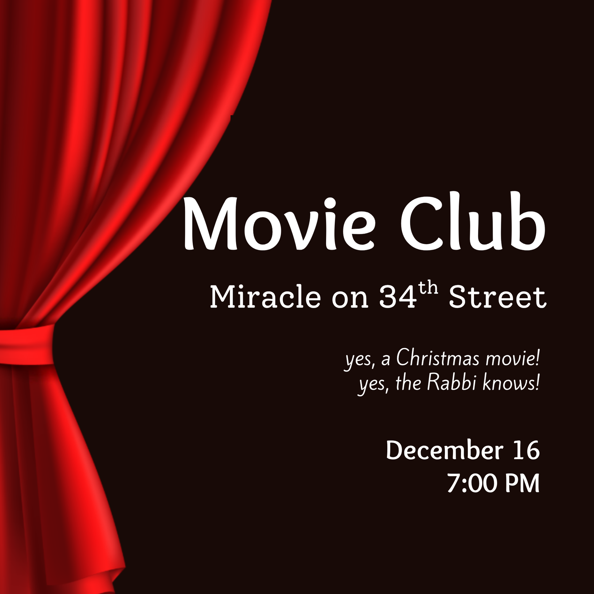 Join the FJCC Movie Club! We watch films at home and then gather online to discuss the selected movie. On Tuesday, December 16th at 7:00 pm we will be talking about the classic, Miracle on 34th Street. See the weekly News and Notes for the login link.