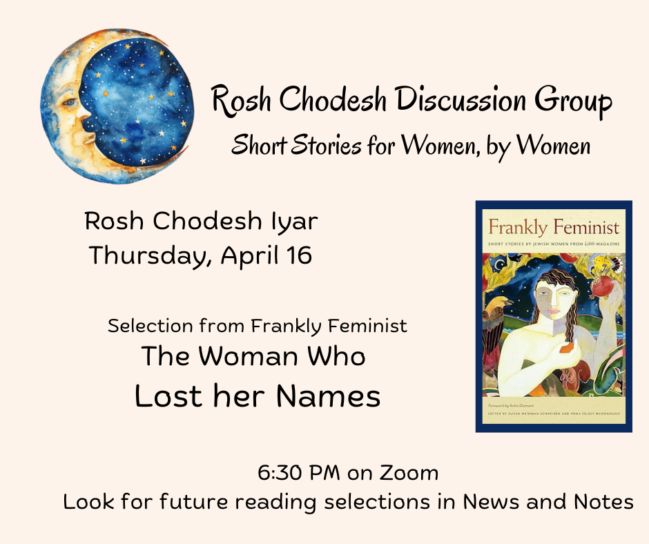 Each month, we celebrate Rosh Chodesh, the new month, with a lively discussion of a very short story (usually about 5 pages) from the book “Frankly Feminist.” This month we will discuss the story “The Woman Who Lost Her Names.” The next gathering will be on Thursday April 16th at 6:30, at the beginning of the month of Iyar. The meetings are on ZOOM and you can get the link in the weekly News and Notes or from the FJCC office.