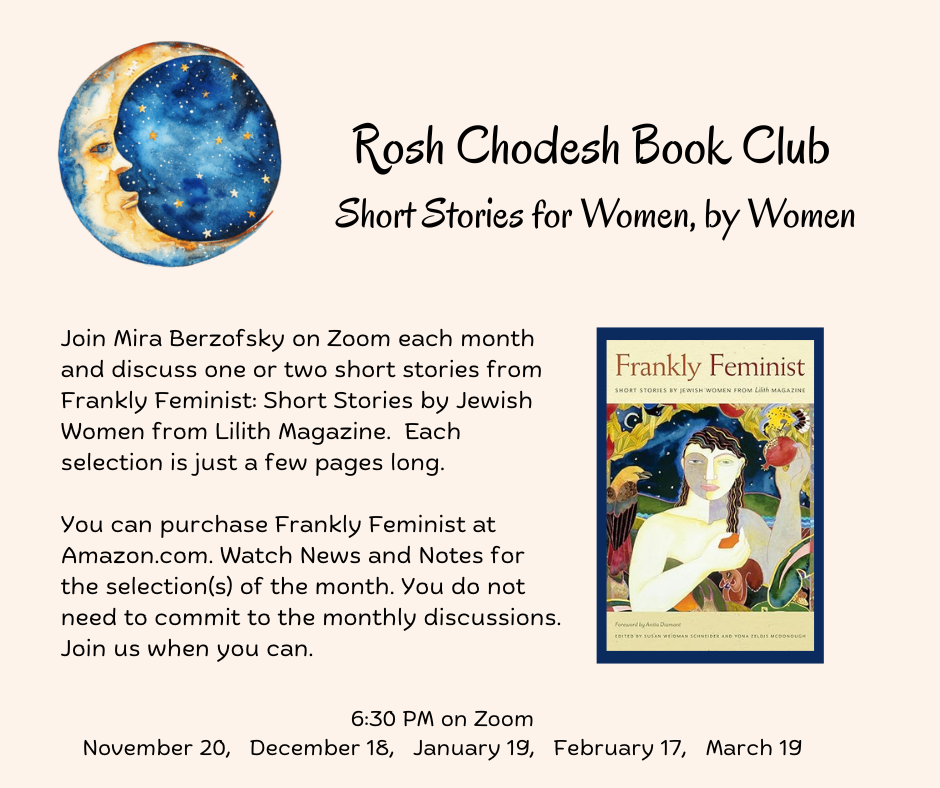 Each month, we celebrate Rosh Chodesh, the new month, with a lively discussion of a very short story (usually about 5 pages) from the book “Frankly Feminist.” The next gathering will be on Tuesday February 17th at 6:30, at the beginning of the month of Adar. The meetings are on ZOOM and you can get the link in the weekly News and Notes or from the FJCC office.