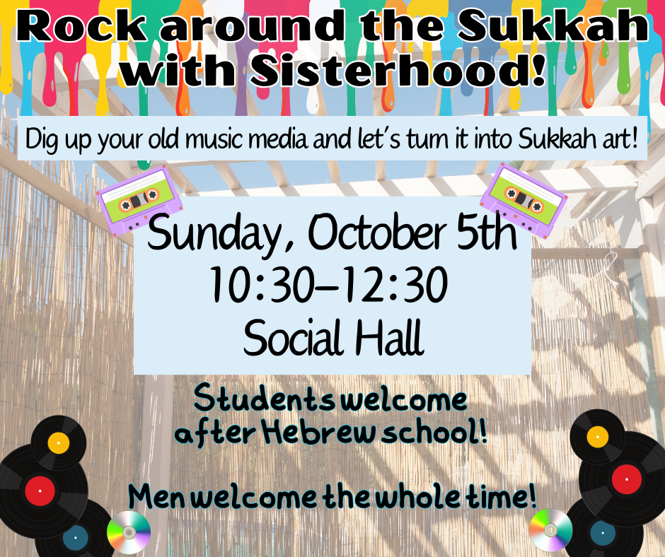 The Sisterhood is hosting a Sukkah Decorating Party! On Sunday, October 5th at 10:30 am (immediately after morning minyan) we will gather together to create fun, creative decorations to beautify the FJCC sukkah. If you have extra CDs at home that are ready for recycling, bring them with you. There will be music and snacks for all the participants.