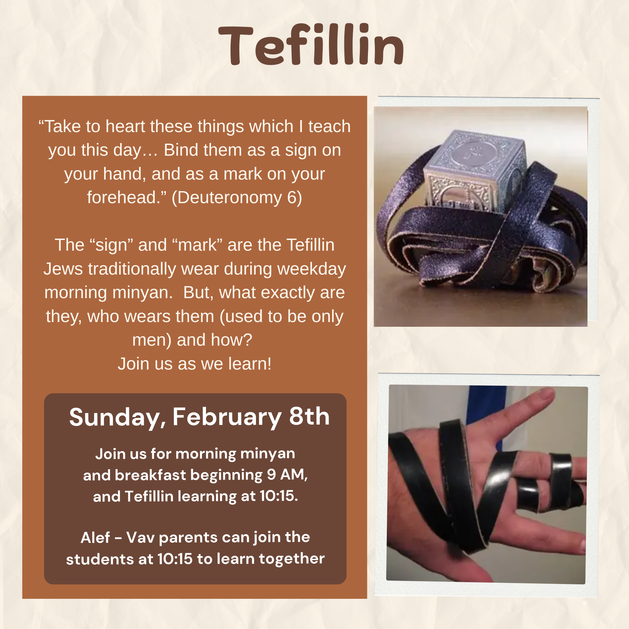We’ll have a communal tefillin wrap on Saturday, February 8th at 10:15 am. Hebrew School parents are encouraged to attend. Please join us — with or without your own tefillin.